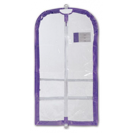 Sturdy pliable PVC garment bag trimmed in your choice of pink or lavender. Three inch expandable gusset accommodates bulky costumes or multiple small garments. Includes three outer pockets, one large and two small for shoes and accessory items.