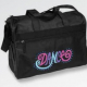 Durable nylon bag with large interior compartment and four pockets. full length front zipper pocket plus two mesh side pockets. The word "DANCE" in bright colours outlined with rhinestones. Includes adjustable shoulder straps. Light weight and folds flat.
