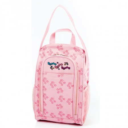 A light pink canvas bag accented with darker pink shooting stars. The dance logo stands out with the bright teal, hot pink, and purple colors. There is an outer pouch on the front as well as mesh pockets on each side and an inner zipper pocket. The inside has an extra layer of lining to ensure lasting durability. This bag is the perfect size for young girls.