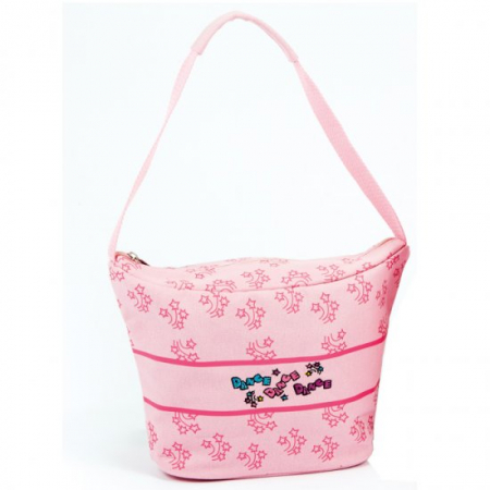 A light pink tote covered with small darker pink shooting stars. There is a large zipper pocket inside as well as an inner lining to help ensure lasting durability. The unique dance logo has bright colors of teal, pink, and purple. This bag is the perfect size for younger girls.