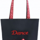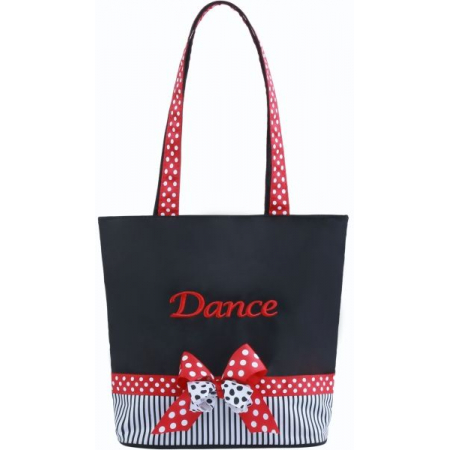 Mindy Collection Dance Small Tote - Adorable black and red design with striped screen print, grosgrain polka dot ribbon trim and bow, and embroidered "Dance".