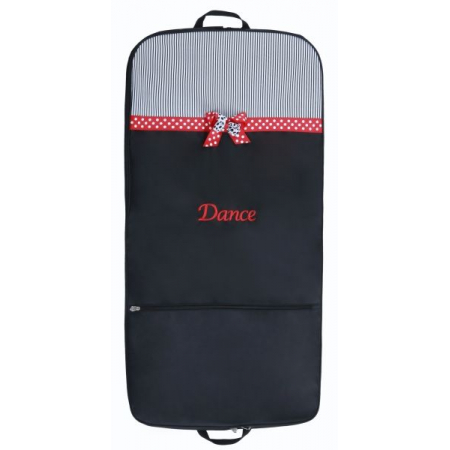 Mindy Collection Garment Bag - Adorable black and red design with striped screen print, grosgrain polka dot ribbon trim and bow, and embroidered "Dance".