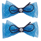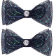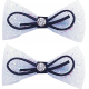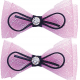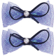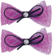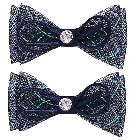 This bow is made with strong nylon mesh featuring iridescent ribbon lining. A thin black bow is attached to the grosgrain ribbon center which is topped with a crystal which lays in a gold setting. The bow is backed with an alligator clip.