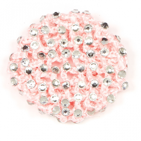A smaller version of our most popular satin ribbon crochet buncover. Rhinestones cover entire buncover. This size is perfect for those with less hair, or for the smaller dancer.