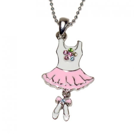 Pretty enameled tutu with dangling ballet slippers is accented with multicolored stones. Makes a great recital gift or a fun piece of jewelry for everyday.