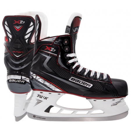 The Vapor X2.7 Skate is built with Bauer's new COMFORT FLEX SYSTEM, which offers step-in comfort, increased visual richness, and additional flex. A one-piece 3D Polycarb quarter construction provides comfort and makes it easier to flex. A Microfiber Liner offers even more comfort and a soft feel. A 40 oz. felt tongue with exposed injected Metatarsal guard gives you advanced level comfort and additional skate flex for maximum agility.
