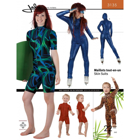A: Hooded zip-front skinsuit with set-in sleeve, zipper shield and lined gusset at crotch.