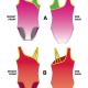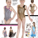 B: Asymmetrical leotard with contrast binding and three spaghetti straps you can criss-cross or braid.