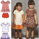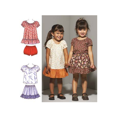 Pull-over top and dress have raglan sleeves, and neckline and bottom edges of sleeves are gathered with elastic in casings. Dress has contrast fabric ruffle at bottom edge. Pull-on skirt has elastic in casing at waist and contrast fabric ruffle at bottom edge. Bloomers have elastic in casings at waist and leg openings.