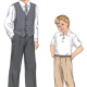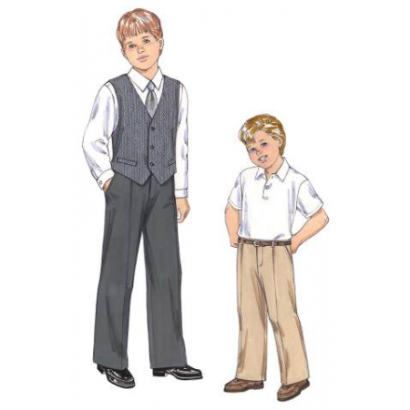 Boys' pants and vest. Pants have tucks on front, fly zipper, front side pockets, back welt pockets, and belt loops. Vest is lined, has front button closure and mock welt pockets.