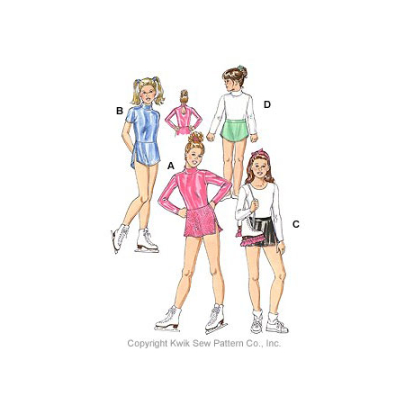 Girls’ leotards and skorts. The leotards with an attached skirt have a mock turtleneck with a snap closure on the back, a waist seam, side hemline slits on the skirt and a back keyhole opening and the leg openings are finished with elastic. View A has full length sleeves and the skirt is from a contrast fabric. View B has short sleeves and the skirt has a shaped hemline. Skorts View C & D has attached panties, a waistband with elastic, side hemline slits and the leg openings are finished with elastic. The Skort View C has a shaped hemline. The Blade Covers have elastic in casing.