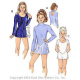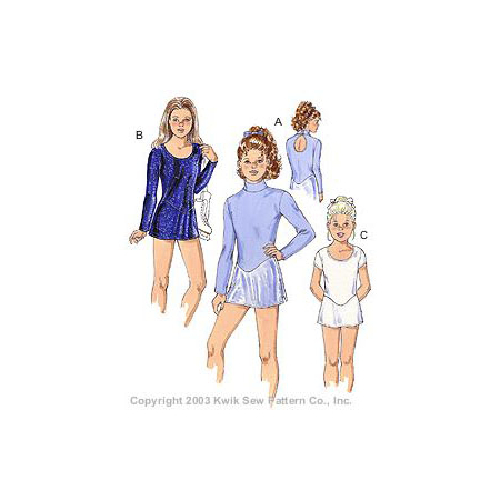 Girls’ leotards with attached skirts have curved waistlines and leg openings finished with elastic. View A has a mock turtleneck with a snap closure, a keyhole opening in the back, and a longer contrast skirt with side hemline slits. View’s B and C have crotch-length skirts and scoop necklines finished with elastic. View B has long sleeves. View C has short sleeves