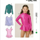 Girls' leotards have leg openings finished with elastic. View A and B have mock turtleneck, zipper at center back, and full length sleeves. View C has full length sleeves. View D has short sleeves. View B, C, and D have an attached circular skirt.