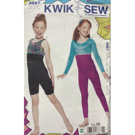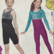 Very close-fitting unitards have scoop neckline finished with elastic, empire waist, and bodice from contrast fabric.