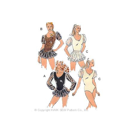 The misses' leotards have sheer short or long puff sleeves with a scoop neckline. The neckline and leg opening are finished with elastic. View A and B have an attached double layer sheer circular skirt. View C has a separate sheer pull-on skirt.