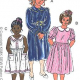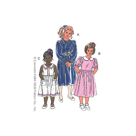 The Girls' Dresses have a zipper at the center back and a gathered skirt. View A has a round collar, gathered long sleeves with cuffs and decorative buttons on the front. The collar and cuffs are trimmed with piping. The contrast belt ties into a bow at the center back. View B has a round contrast collar, gathered short sleeves with cuffs, and piping trim on the collar and cuffs. The View C sleeveless dress has a collar, patch pockets and a decorative front tab with buttons. The collar, front tab, pockets and bottom edge are trimmed with ribbons.