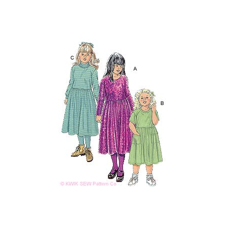 The girls' pull-over dresses have a gathered skirt and they are designed for stretch knits only with 20% stretch across the grain. We recommend using single knit, interlock, velour and double knit.