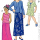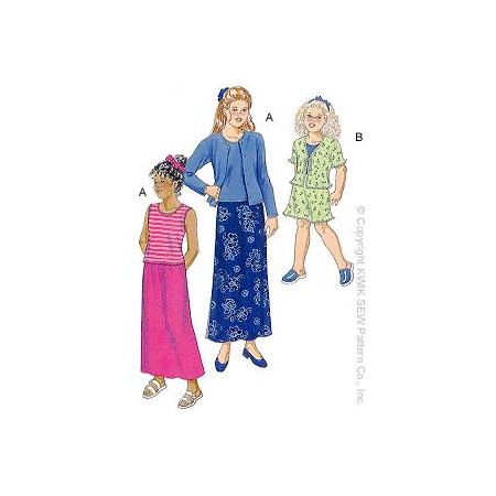 This is a girls’ skirt, cardigan and top pattern. The pull-on skirt has a stitched elastic waist and may be made in either of two lengths. The long skirt is hemmed, while the short skirt’s hem is finished with lettuce edging.