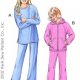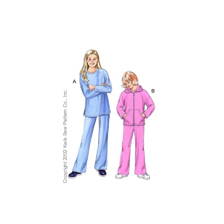 Girls' raglan sleeve shirts and pull-on pants. The View A pullover shirt has a round neckline with a ribbing neckband and side hemline slits. The View B shirt has a zipper front, patch pockets and a hood. The pants have slightly flared legs and elastic in casing at the waist.