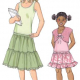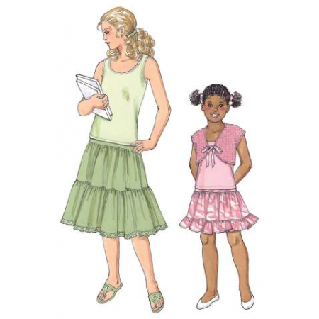 Girls' skirt, top, and bolero. Pull-on skirts have elastic waist and ruffles. Bottom edge of skirts have optional lace or trim. Tank top has neckline and armholes finished with narrow hems. Bolero has ribbon tie closure and shoulders extend to form cap sleeves.