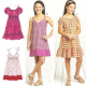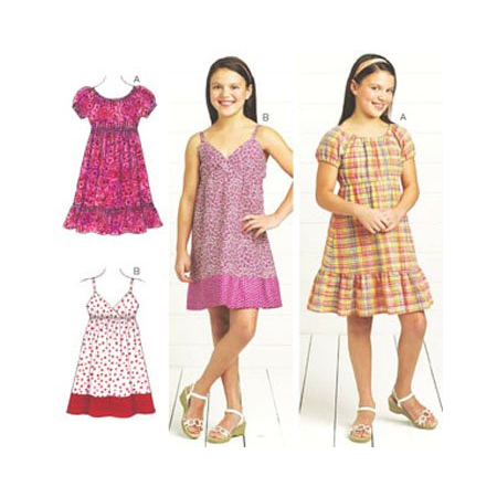 Pull-over dresses have empire waist with elastic in casing. View A has raglan sleeves, round neckline gathered with elastic, short sleeves with elastic, and ruffle at bottom edge. View B has lapped front, narrow shoulder straps, and contrast fabric extension at bottom edge.