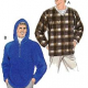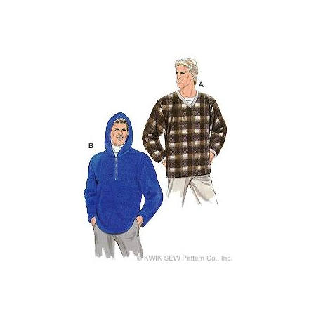 The pull-over shirts have extended shoulders. View A has a chest patch pocket and V-neckline. The neckband and sleeve bands are from a contrast fabric. View B has a front and back yoke, a zipper on the front yoke and a hood.