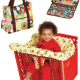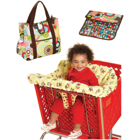 SEAT COVER: Seat cover is double with contrast fabric on one side and batting between layers, has elastic in casing in outer edge, leg openings finished with bias tape, pocket, loops to hold toys, and safety belt with buckle. Cover fits most shopping carts and can be used on high chairs.