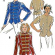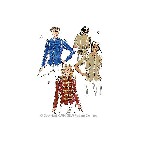 The misses' blouse jacket has a princess line front and shoulder pads. View A and B have a stand-up collar and long sleeves. View A has self fabric trim which forms buttons loops. View B has purchased trim. View C has a round neckline, short sleeves and a belt that ties on the back.