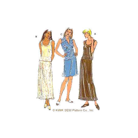 This A-line shaped skirt is lined with a zipper opening in the left side seam and a narrow waistband. Instructions for the skirt lining are given for a skirt from a sheer fabric. The tops have a center back seam and bust darts. View A and B tops have scooped necklines. The neckline and armholes are finished with self fabric bias cut bindings. View A shows the top and skirt using a fabric edge for the finish. View C top has a slit opening at the center front and a collar with facings. The armholes are finished with a self fabric bias cut binding.