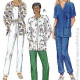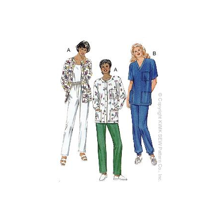 View A is a shirt jacket with snap or button closures, three patch pockets and long sleeves with ribbing cuffs. View B is a pull-over shirt with short sleeves, three patch pockets, a V-neckline and side hemline slits. The pull-on pants have front pockets and a waistband with stitched elastic. The pants in View A are hemmed and View B has ribbing leg cuffs.