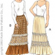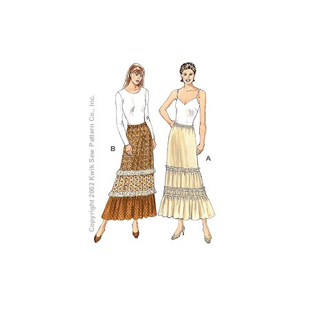 The misses' pull-on skirts have an elastic waist. View A has ruffled edges at the top of each tier and an optional ribbon trim. View B can be made from one or three contrast fabrics, and has decorative lace in the seams.