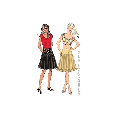 Misses' skirts and tops. The gathered skirt has a fitted yoke with a zipper in the side seam and an optional embellishment on the front yoke. View B has a ruffle at the hemline. The pullover tops have cap sleeves and the necklines and armholes finished with elastic in casings. View B is cropped with elastic in casing under the bust.