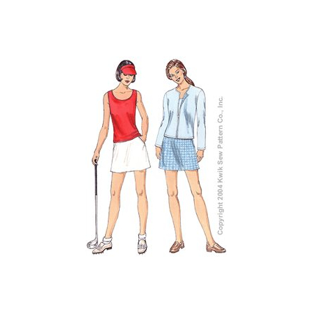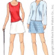 Misses' skort, tank top and cardigan. Fitted skort has deep front side pockets, a center back zipper, and a narrow waistband. The skirt is slightly A-lined and the shorts are from lining. The close-fitting cardigan has a front zipper, the neckline and front edges are finished with facings from contrast fabric. The close-fitting tank top has a neckline and armholes finished with narrow hems.