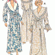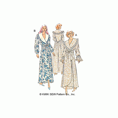 These wrap robes have wide shawl collars, gathered puffed sleeves and the back skirt is gathered to the V-shaped bodice back. The tie belt is attached to the side seams, the pockets are in the side seams and the hemline is shaped. View A has shaped sleeve ruffles, lace trim on the collar and the sleeves and elastic in casing on the sleeves. View B has a contrasting upper collar, cuffs on the sleeves and optional piping on the collar and the sleeve cuffs.