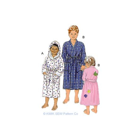 The wrap robes have extended shoulders, a tie belt and patch pockets. They are designed for woven and knit fabrics such as terry cloth, waffle weave, flannel, velour, single knit and interlock.