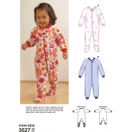 Toddlers' sleeper has front zipper extending into one inside leg, ribbing neckband, raglan sleeves with ribbing cuffs, and tab with snap closure. View A has feet with gripper fabric. View B legs have ribbing cuffs.