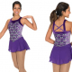 A vivid purple velvet dress with amethyst and soft lime glitter fans, shaped sweetheart trim, wide straps with a pair of crossed back sequin straps and a flat, barely shaped georgette skirt.