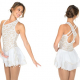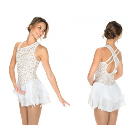 A snowy white velvet dress drizzled with golden vines. Intertwining back loop straps, a flat flutter layered skirt edged in gold asymmetrical styling make this alluring. Lined.