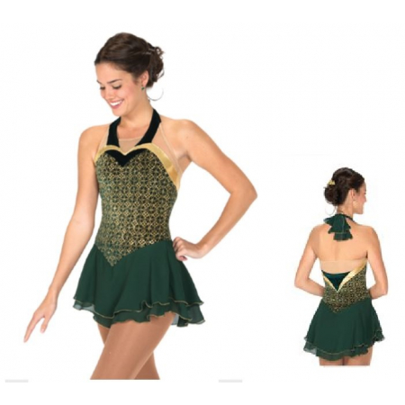 Balmoral Dress - Rich velvet dress with intricate gold glitter pattern, curving gold foil that looks intertwined with the velvet straps at the front, a true halter style back with a clip and georgette ties that match the double layer skirt.