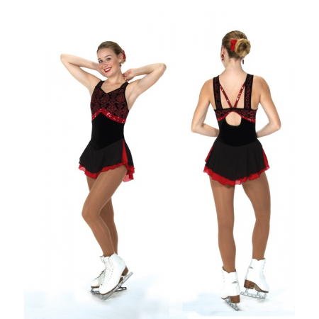 A classic black and red colour theme and empire styling add Spanish flavour to this velvet dress. Accents include sequin trim, wide glitter straps, a cut out back and a double layer skirt of black over red georgette.
