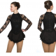 Black lace dress with long finger point sleeves, a high neck and bodice of lace over glitter supplex, a back zipper and filmy, double layer skirt.