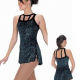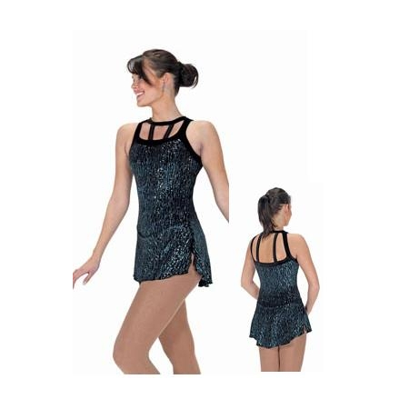 A black velvet dress with a ton of silver/turquoise glitter, bar strap detail front and back, a flat shaped skirt and back clip.