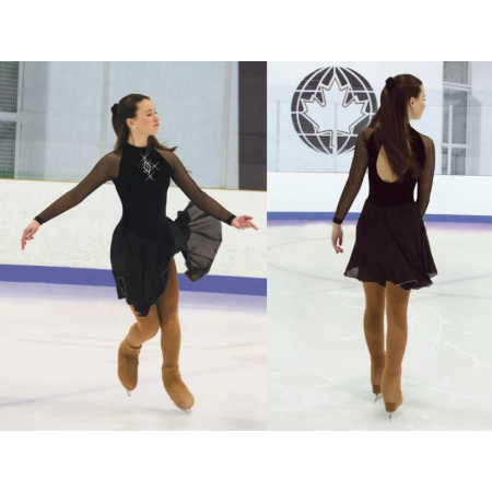 This is the essential black dance dress. It exudes timeless elegance with long mesh sleeves, a high neck with a diamond burst crystal accent and a traditional back keyhole.