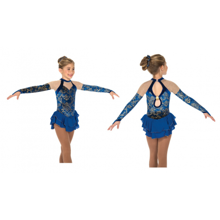 This deep royal blue velvet dress is set off by rich gold and sapphire glitter and classy glove look sleeves with finger points. The matching double layer skirt is edged in gold.