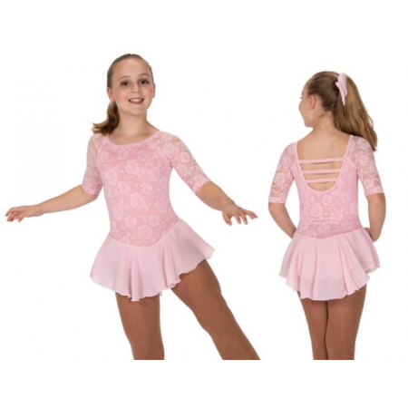 Traditional style dresses perfect for everything from practice to tests and exams. Elbow length lace sleeves match the lace overlay in the body, and the jewel neckline scoops lower at the back to accommodate a trio of parallel straps.