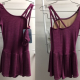 A sumptuous combination of red velvet and a sophisticated brocade glitter pattern in black and gold. Asymmetrical styling with mesh sleeves and a slanted overlapping front skirt. Back keyhole and slanted back straps.