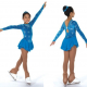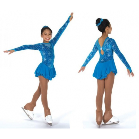 Rich capri blue dress with a shaped front neckline, double skirt with a scalloped hem and a dropped diamond keyhole back accented by a diamond shaped buckle.