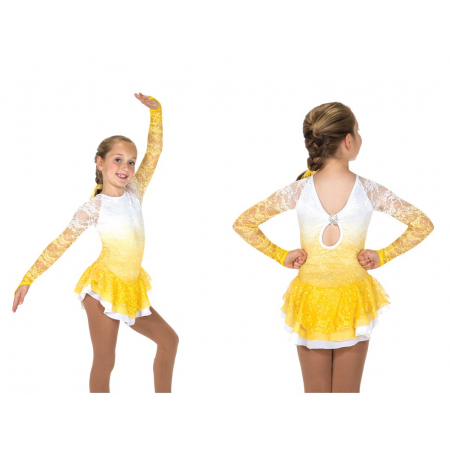 Elegant glitter lace dress that shades from icy white at the neck to a lovely sunny yellow at the wrists and hemline. A triple layer skirt, finger points and a locket style back keyhole with a crystal buckle add the finishing touches. Lined.