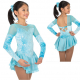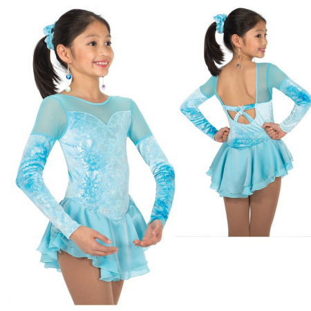 A lustrous, pearly, foiled velvet dress in marbled aqua shades with a satin chiffon and georgette skirt, mesh sweetheart neckline and scooped back with crystal accent linking the straps. Sizes: Youth 8-10,