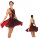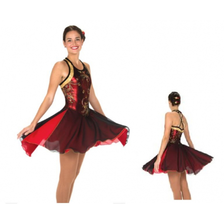 Dynasty Dance Dress - A gold embroidered black mesh is layered over red hologram and paired with gold sequin trim. Intertwining back straps of black and gold sequins and a side-slit black georgette top skirt complete the ensemble.